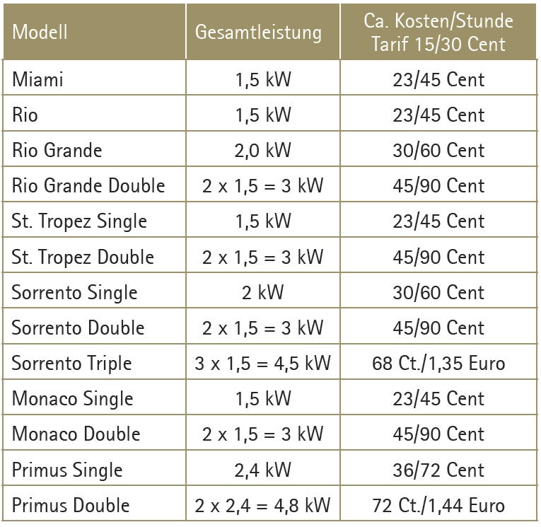 Die genauen Betriebskosten sind abhängig vom Tarif Ihres Stromlieferanten und vom eingesetzten Heizstrahler. Der Abgabepreis für 1 kW/h variiert in Deutschland je nach Ihrem Tarif (Industrie-/Gewerbestrom) von derzeit 15 bis 30 Cent.