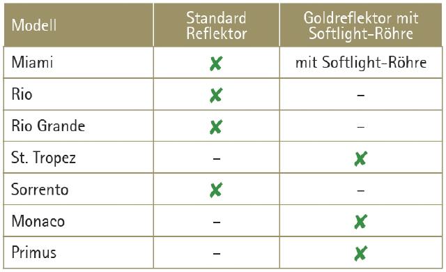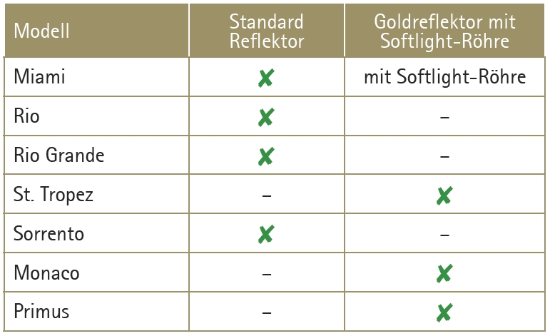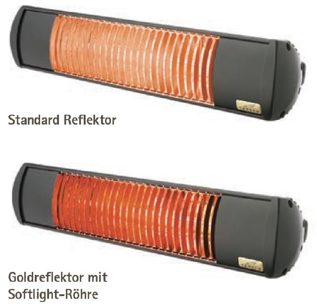 Bei Standard Reflektoren wirkt das Licht heller und erscheint in einem etwas helleren Rotton. Bei den Geräten mit Goldreflektor und Softlight-Röhre ist die Helligkeit reduziert. Der rötliche Farbton ist hierbei etwas dunkler.